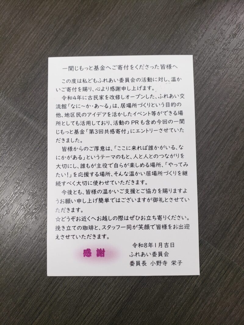 日常的に地区民が気楽に立ち寄り、ふれあいや交流、地区民のアイデアを活かしたイベント等ができる場所を創出すべく、猿沢地区振興会の実証事業として、古民家を改修した交流館「なに~か・あ~る」が開設されました。実証期間を終え、令和7年4月より私たちが自主運営しています。「ここに来れば誰かがいる、なにかがある」というテーマのもと、地域の「居場所」として、「より良い交流事業(ふれあい喫茶/体験型ワークショップ等)」を運営する企画運営費に活用します!